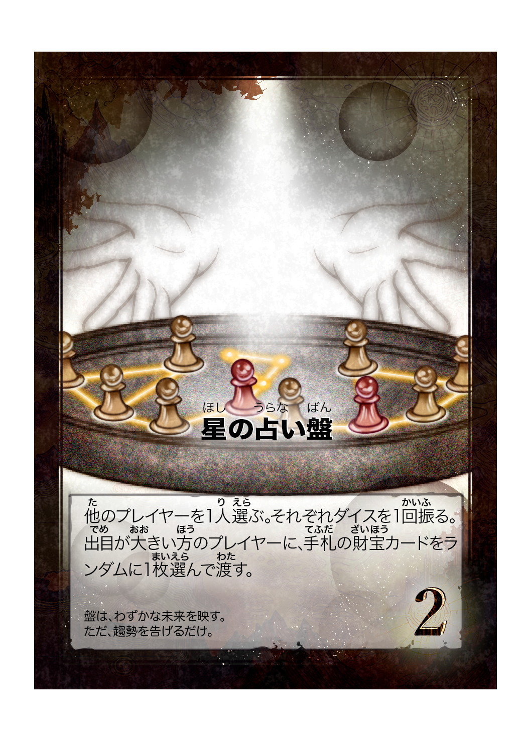 他のプレイヤーを1人選ぶ。それぞれダイスを1回振る。出目が大きい方のプレイヤーに、手札の財宝カードをランダムに1枚選んで渡す。