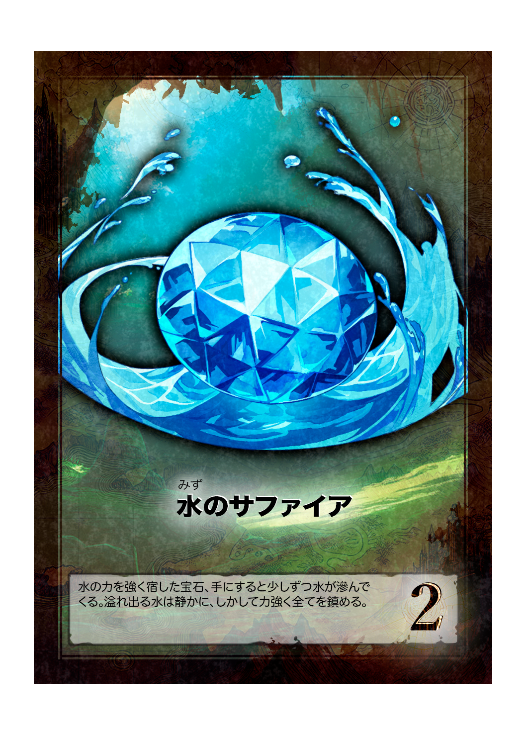 カード詳細:水のサファイア 2026 4/29 カードリスト 製品情報 2026年4月29日 カード名 水のサファイア(みずのさふぁいあ) 分類 財宝(宝石) 得点 2点 カード効果 ゲーム内効果なし フレイバーテキスト 水の力を強く宿した宝石、手にすると少しずつ水が滲んでくる。溢れ出る水は静かに、しかして力強く全てを鎮める。 カードリスト 製品情報 カードリスト 宝石 水のサファイア 財宝 よかったらシェアしてね! URLをコピーしました! URLをコピーしました! カード詳細:火のルビー カード詳細:風のエメラルド 関連記事 カード詳細:双光陽影のツインストーン カード詳細:混沌変転のトラペゾヘドロン カード詳細:不滅不壊のアダマンタイト カード詳細:双翼流転のアレキサンドライト カード詳細:怒血龍眼のスピネル カード詳細:戦神のヘマタイト カード詳細:恋心のガーネット カード詳細:魔術のアメジスト
