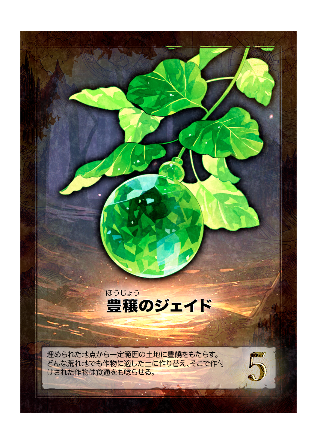 カード詳細:豊穣のジェイド 2026 4/30 カードリスト 製品情報 2026年4月30日 カード名 豊穣のジェイド(ほうじょうのじぇいど) 分類 財宝(宝石) 得点 5点 カード効果 ゲーム内効果なし フレイバーテキスト 埋められた地点から一定範囲の土地に豊饒をもたらす。どんな荒れ地でも作物に適した土に作り替え、そこで作付けされた作物は食通をも唸らせる。 カードリスト 製品情報 カードリスト 宝石 豊穣のジェイド 財宝 よかったらシェアしてね! URLをコピーしました! URLをコピーしました! カード詳細:道標のトパーズ カード詳細:魔術のアメジスト 関連記事 カード詳細:双光陽影のツインストーン カード詳細:混沌変転のトラペゾヘドロン カード詳細:不滅不壊のアダマンタイト カード詳細:双翼流転のアレキサンドライト カード詳細:怒血龍眼のスピネル カード詳細:戦神のヘマタイト カード詳細:恋心のガーネット カード詳細:魔術のアメジスト