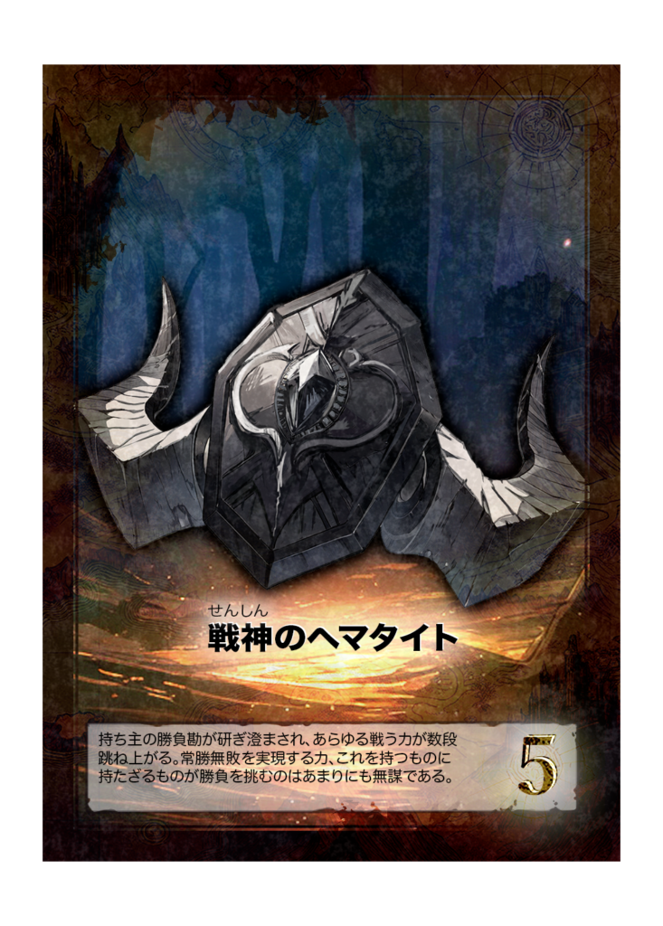 カード名 戦神のヘマタイト(せんしんのへまたいと) 分類 財宝(宝石) 得点 5点 カード効果 ゲーム内効果なし フレイバーテキスト 持ち主の勝負勘が研ぎ澄まされ、あらゆる戦う力が数段跳ね上がる。常勝無敗を実現する力、これを持つものに持たざるもの... -