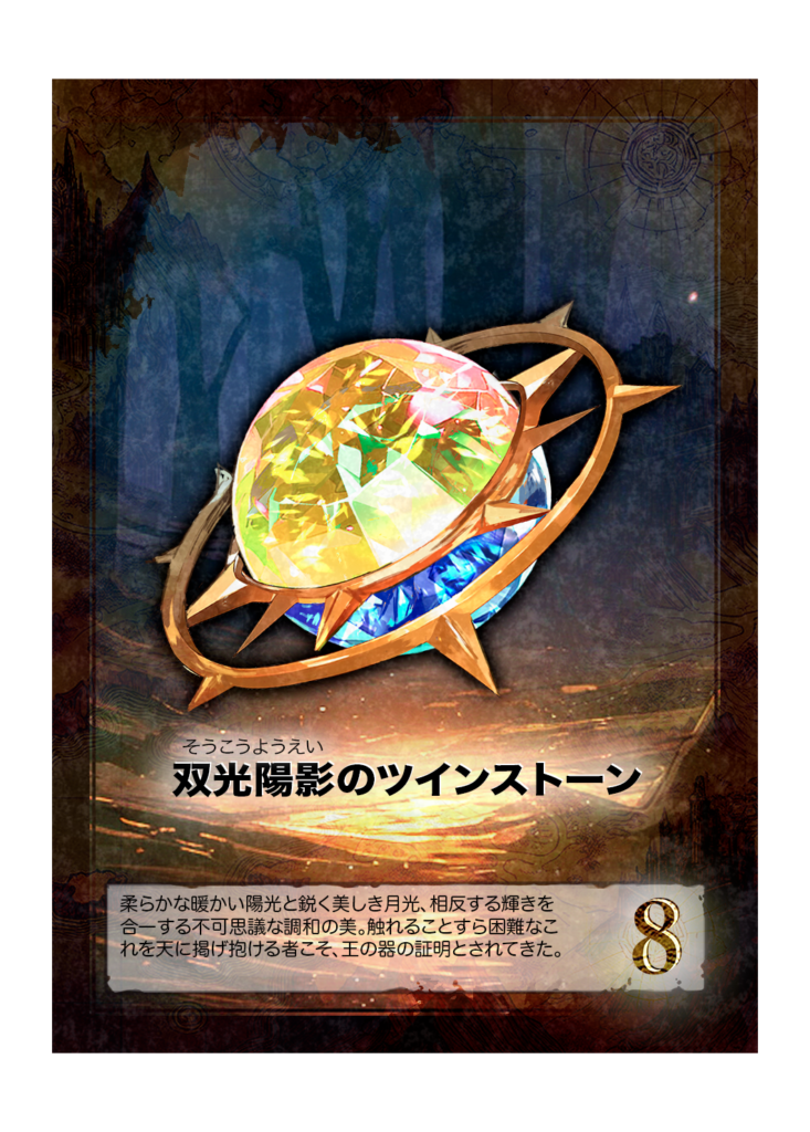 カード名 双光陽影のツインストーン(そうこうようえいのついんすとーん) 分類 財宝(宝石) 得点 8点 カード効果 ゲーム内効果なし フレイバーテキスト 柔らかな暖かい陽光と鋭く美しき月光、相反する輝きを合一する不可思議な調和の美。触れることすら... -