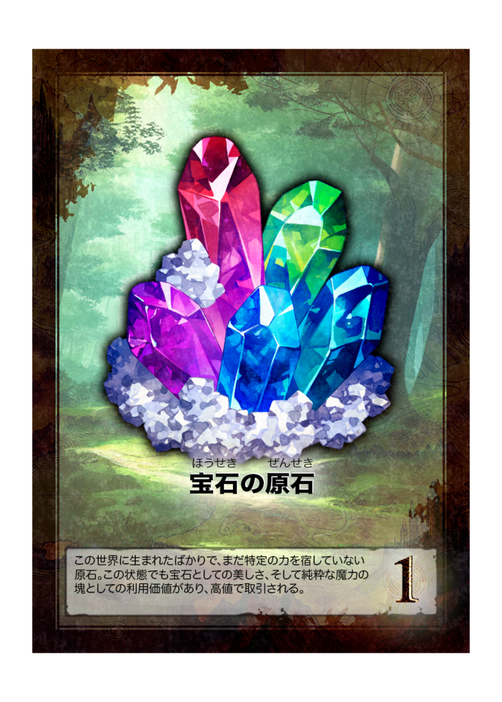 カード名 宝石の原石(ほうせきのげんせき) 分類 財宝(宝石) 得点 1点 カード効果 ゲーム内効果なし フレイバーテキスト この世界に生まれたばかりで、まだ特定の力を宿していない原石。この状態でも宝石としての美しさ、そして純粋な魔力の塊としての... -
