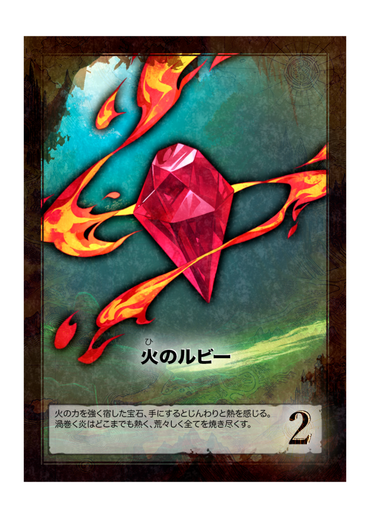 カード名 火のルビー(ひのるびー) 分類 財宝(宝石) 得点 2点 カード効果 ゲーム内効果なし フレイバーテキスト 火の力を強く宿した宝石、手にするとじんわりと熱を感じる。渦巻く炎はどこまでも熱く、荒々しく全てを焼き尽くす。 -