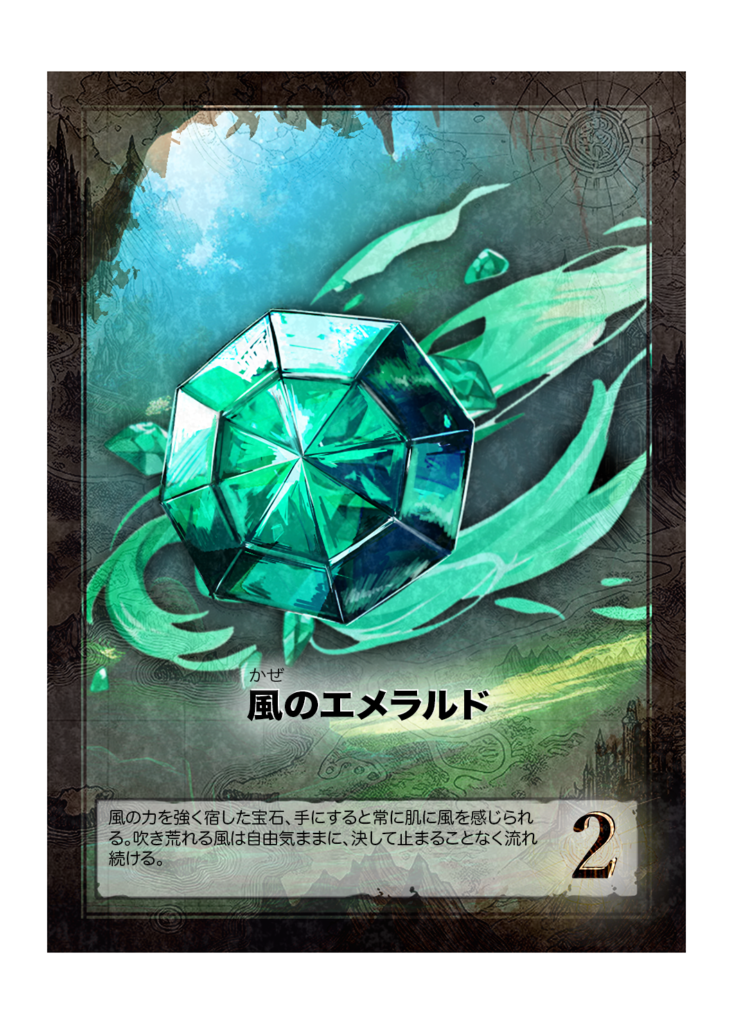 カード名 風のエメラルド(かぜのえめらるど) 分類 財宝(宝石) 得点 2点 カード効果 ゲーム内効果なし フレイバーテキスト 風の力を強く宿した宝石、手にすると常に肌に風を感じられる。吹き荒れる風は自由気ままに、決して止まることなく流れ続ける。 -