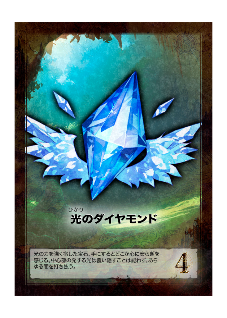 カード名 光のダイヤモンド(ひかりのだいやもんど) 分類 財宝(宝石) 得点 4点 カード効果 ゲーム内効果なし フレイバーテキスト 光の力を強く宿した宝石、手にするとどこか心に安らぎを感じる。中心部の発する光は覆い隠すことは能わず、あらゆる闇を... -