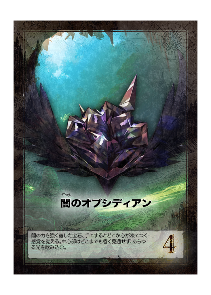 カード名 闇のオブシディアン(やみのおぶしでぃあん) 分類 財宝(宝石) 得点 4点 カード効果 ゲーム内効果なし フレイバーテキスト 闇の力を強く宿した宝石、手にするとどこか心が凍てつく感覚を覚える。中心部はどこまでも昏く見通せず、あらゆる光を... -