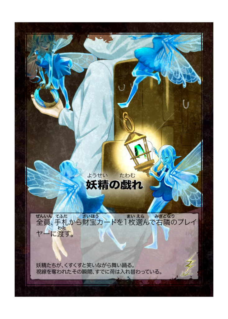 カード名 妖精の戯れ(ようせいのたわむれ) 分類 イベント カード効果 全員、手札から財宝カードを1枚選んで右隣のプレイヤーに渡す。 フレイバーテキスト 妖精たちが、くすくすと笑いながら舞い踊る。視線を奪われたその瞬間、すでに荷は入れ替わっている。 -