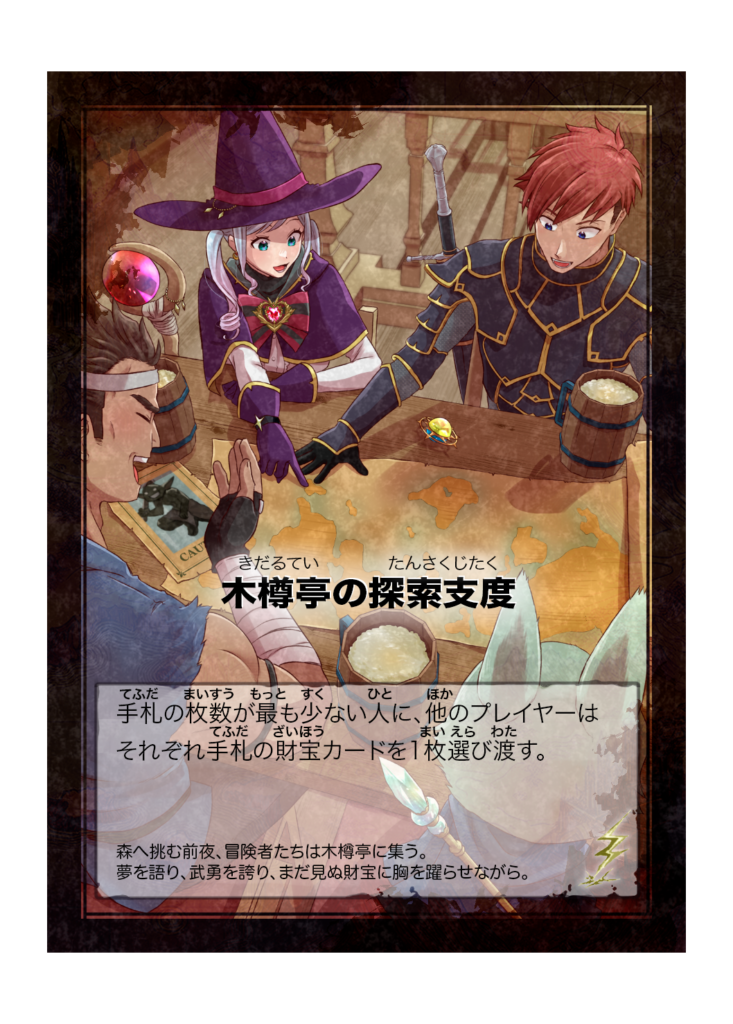 カード名 木樽亭の探索支度(きだるていのたんさくじたく) 分類 イベント カード効果 手札の枚数が最も少ない人に、他のプレイヤーはそれぞれ手札の財宝カードを1枚選び渡す。 フレイバーテキスト 森へ挑む前夜、冒険者たちは木樽亭に集う。夢を語り、武... -