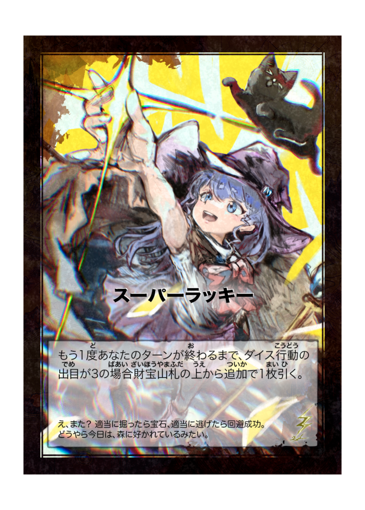 カード名 スーパーラッキー(すーぱーらっきー) 分類 イベント カード効果 もう1度あなたのターンが終わるまで、ダイス行動の出目が3の場合財宝山札の上から追加で1枚引く。 フレイバーテキスト え、また? そんなに?適当に掘ったら宝石、適当に逃げたら... -