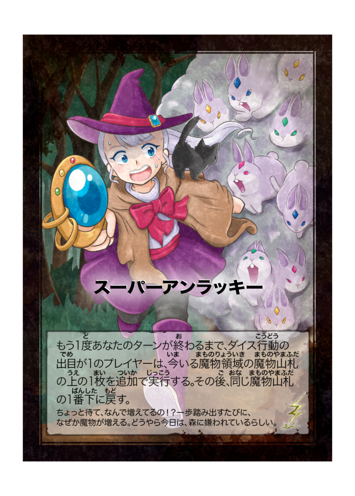 カード名 スーパーアンラッキー(すーぱーあんらっきー) 分類 イベント カード効果 もう1度あなたのターンが終わるまで、ダイス行動の出目が1のプレイヤーは、今いる魔物領域の魔物山札の上の1枚を追加で実行する。その後、それを同じ魔物山札の1番下に戻... -