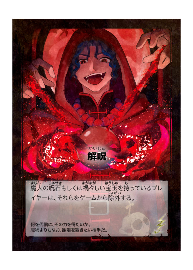 カード名 解呪(かいじゅ) 分類 イベント カード効果 魔人の呪石もしくは禍々しい宝玉を持っているプレイヤーは、それらをゲームから除外する。 フレイバーテキスト 何を代償に、その力を得たのか。魔物よりもなお、距離を置きたい相手だ。 -
