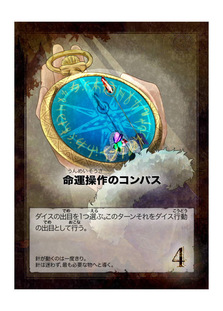 カード名 命運操作のコンパス(めいうんそうさのこんぱす) 分類 財宝(魔道具) 得点 4点 カード効果 ダイスの出目を1つ選ぶ。このターンそれをダイス行動の出目として行う。 フレイバーテキスト 針が動くのは一度きり。針は迷わず、最も必要な物へと導く。 -