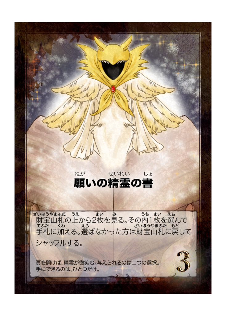 カード名 願いの精霊の書(ねがいのせいれいのしょ) 分類 財宝(魔道具) 得点 3点 カード効果 財宝山札の上から2枚を見る。その内1枚を選んで手札に加える。選ばなかった方は財宝山札に戻してシャッフルする。 フレイバーテキスト 頁を開けば、精霊が微... -