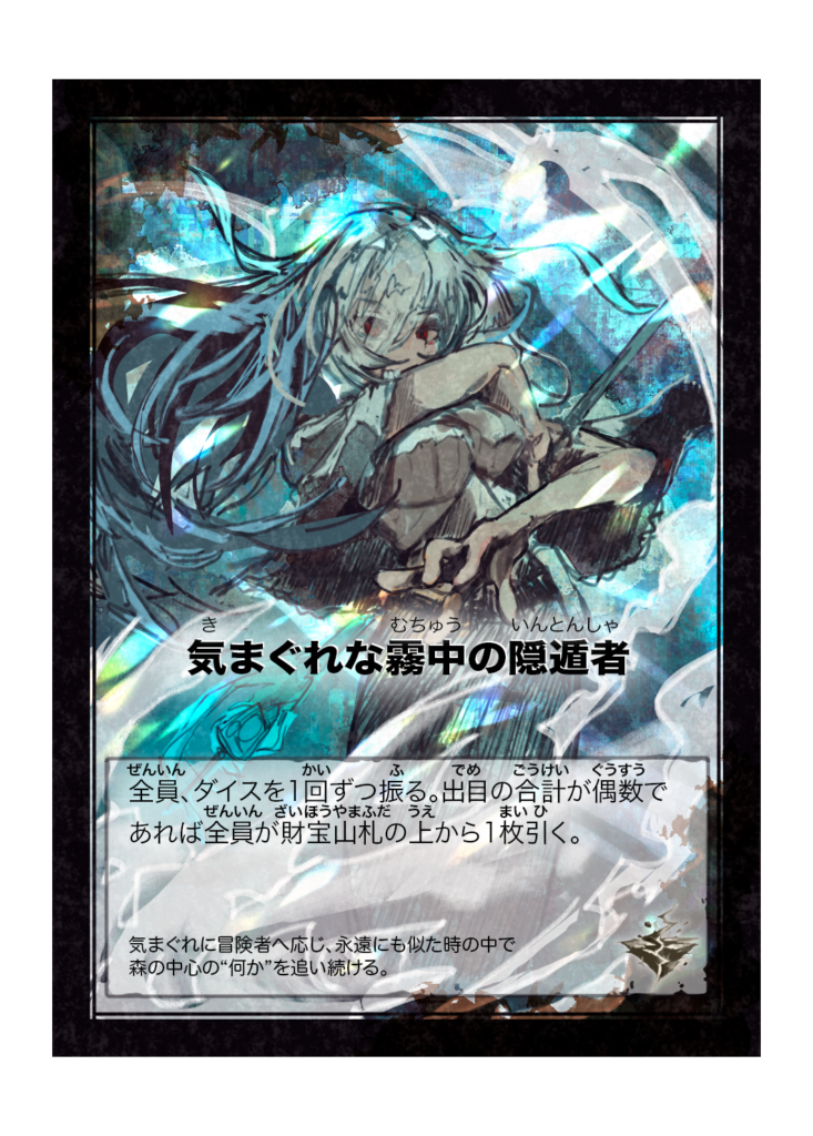 カード名 気まぐれな霧中の隠遁者(きまぐれなむちゅうのいんとんしゃ) 分類 魔物(空白地帯) カード効果 全員、ダイスを1回ずつ振る。出目の合計が偶数であれば全員が財宝山札の上から1枚引く。 フレイバーテキスト 気まぐれに冒険者へ応じ、永遠にも似... -