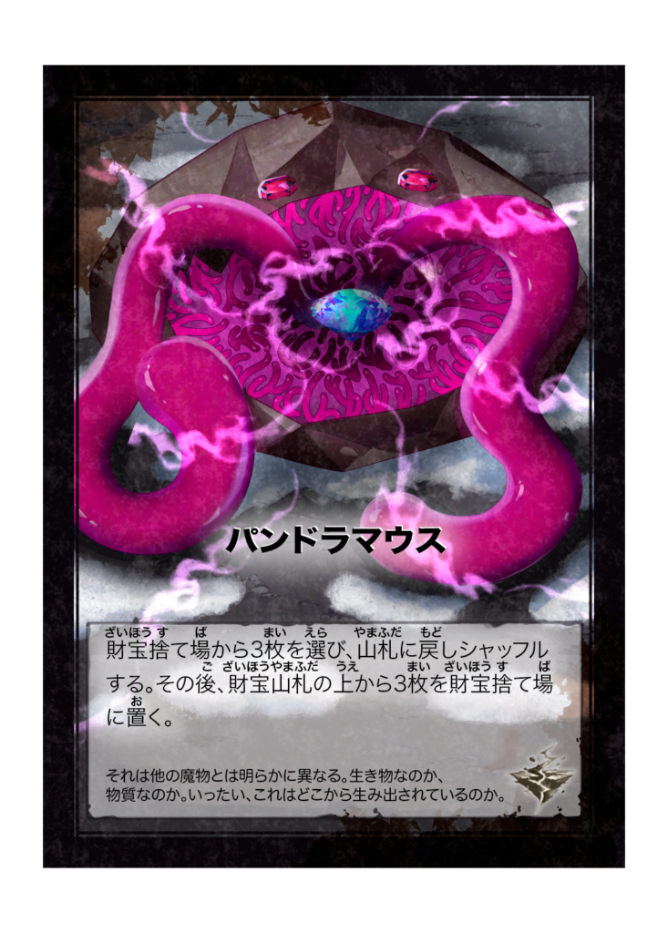 カード名 パンドラマウス(ぱんどらまうす) 分類 魔物(空白地帯) カード効果 財宝捨て場から3枚を選び、山札に戻しシャッフルする。その後、財宝山札の上から3枚を財宝捨て場に置く。 フレイバーテキスト それは他の魔物とは明らかに異なる。生き物なの... -