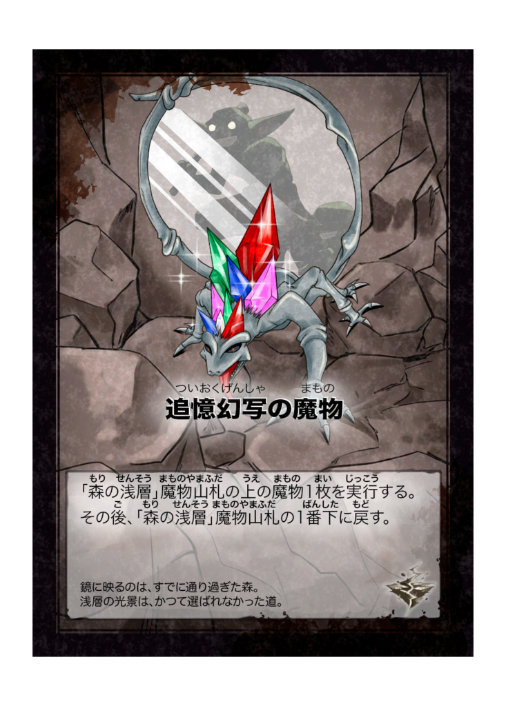 カード名 追憶幻写の魔物(ついおくげんしゃのまもの) 分類 魔物(空白地帯) カード効果 「森の浅層」魔物山札の上の魔物1枚を実行する。その後、「森の浅層」魔物山札の1番下に戻す。 フレイバーテキスト 鏡に映るのは、すでに通り過ぎた森。浅層の光景... -