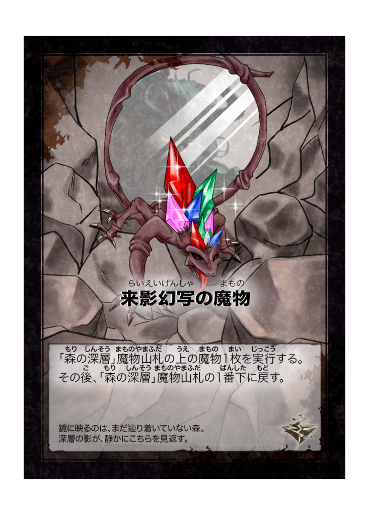 カード名 来影幻写の魔物(らいえいげんしゃのまもの) 分類 魔物(空白地帯) カード効果 「森の深層」魔物山札の上の魔物1枚を実行する。その後、「森の深層」魔物山札の1番下に戻す。 フレイバーテキスト 鏡に映るのは、まだ辿り着いていない森。深層の... -