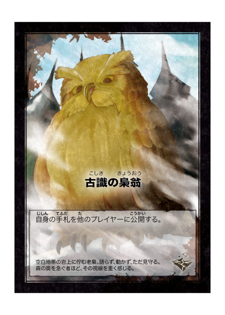 カード名 古識の梟翁(こしきのきょうおう) 分類 魔物(空白地帯) カード効果 自身の手札を他のプレイヤーに公開する。 フレイバーテキスト 空白地帯の岩上に佇む老梟。語らず、動かず、ただ見守る。森の奥を急ぐ者ほど、その視線を重く感じる。 -