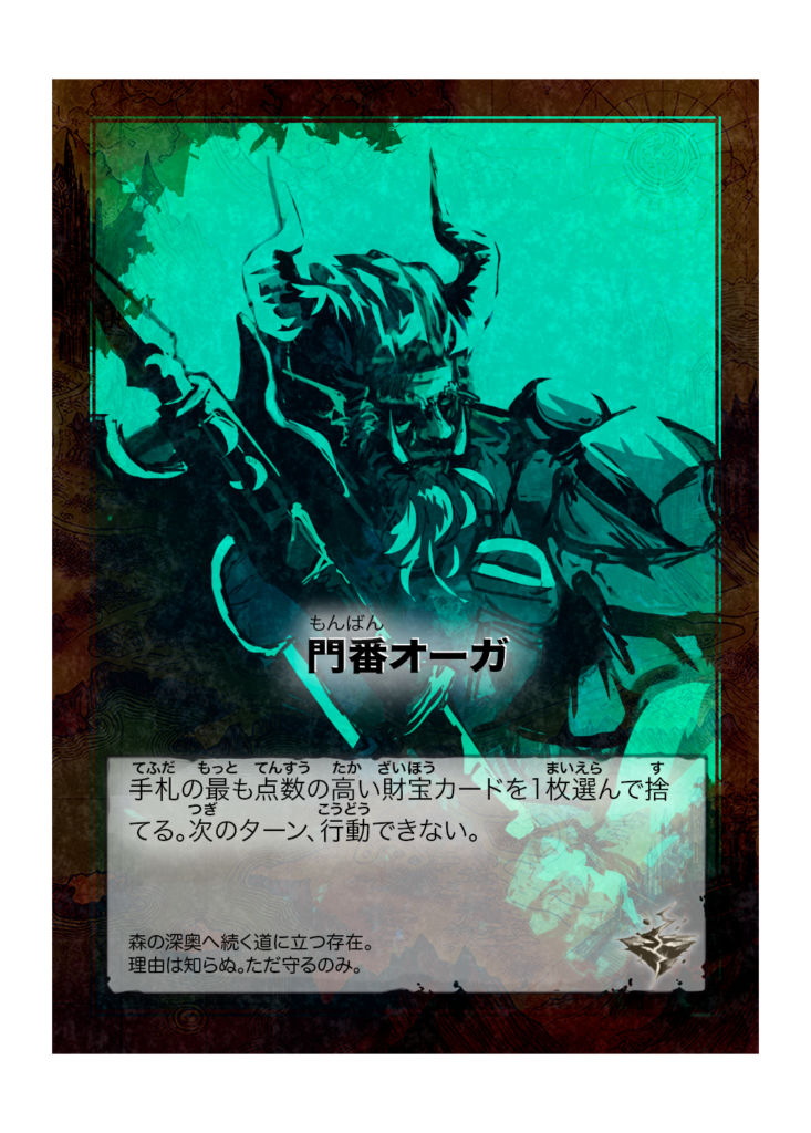 カード名 門番オーガ(もんばんおーが) 分類 魔物(森の深層) カード効果 手札の最も点数の高い財宝カードを1枚選んで捨てる。次のターン、行動できない。 フレイバーテキスト 森の深奥へ続く道に立つ存在。理由は知らぬ。ただ守るのみ。 -