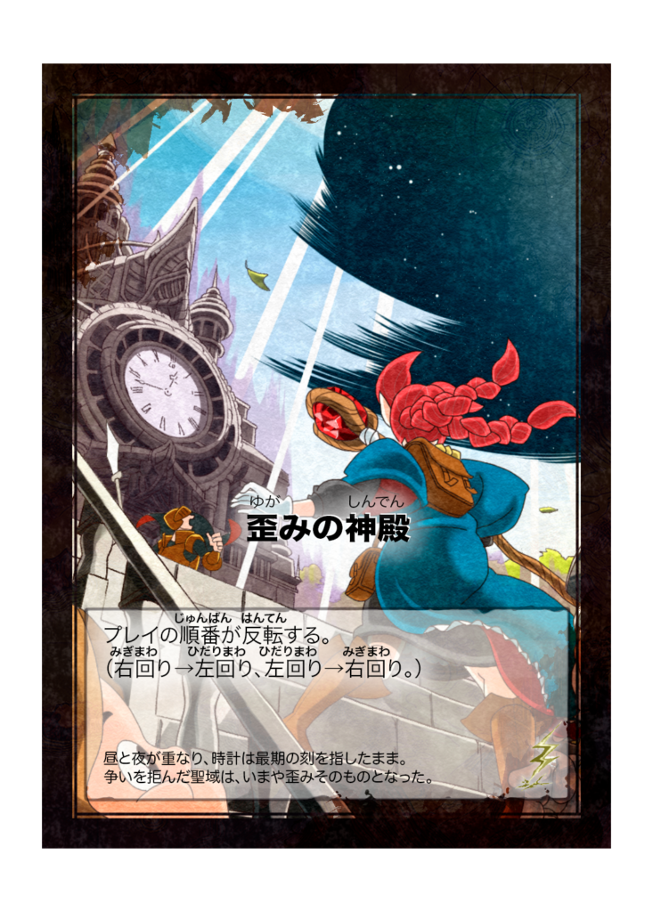 カード名 歪みの神殿(ゆがみのしんでん) 分類 イベント カード効果 プレイの順番が反転する。(右回り→左回り、左回り→右回り) フレイバーテキスト 昼と夜が重なり、時計は最期の刻を指したまま。争いを拒んだ聖域は、いまや歪みそのものとなった。