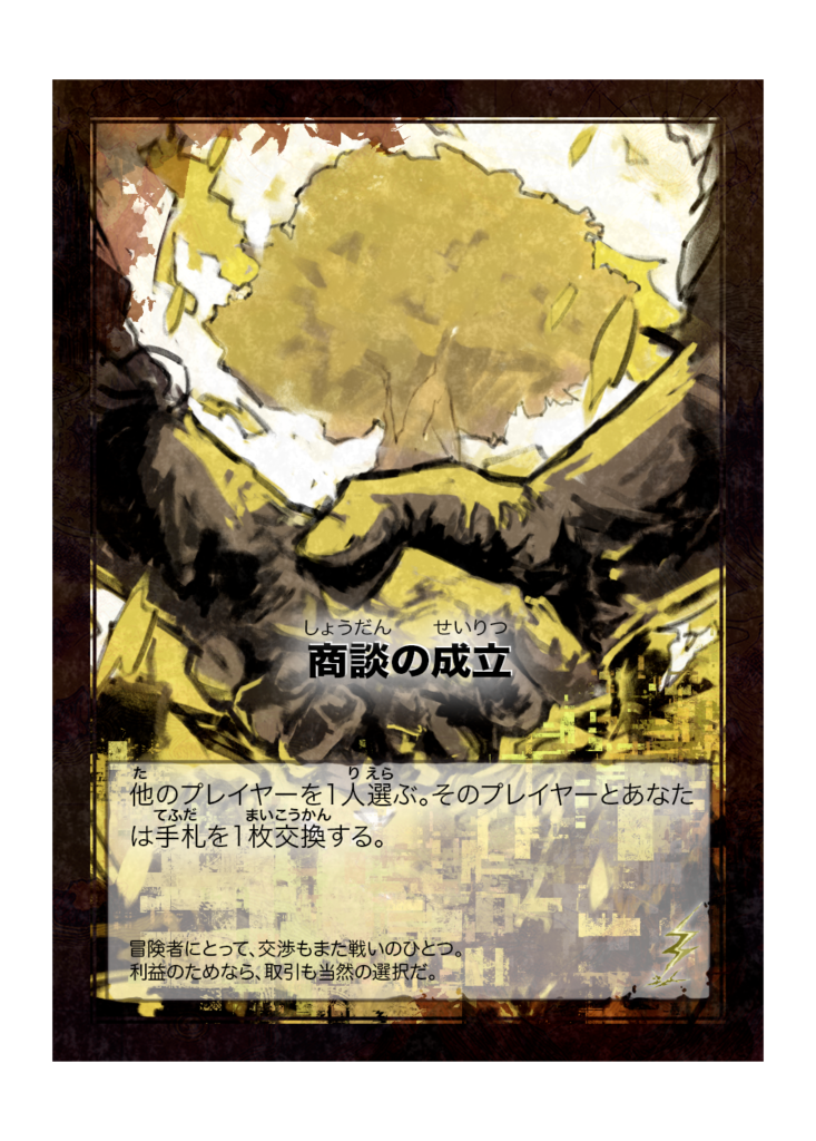 カード名 商談の成立(しょうだんのせいりつ) 分類 イベント カード効果 他のプレイヤーを1人選ぶ。そのプレイヤーとあなたは手札を1枚交換する。 フレイバーテキスト 冒険者にとって、交渉もまた戦いのひとつ。利益のためなら、取引も当然の選択だ。 -