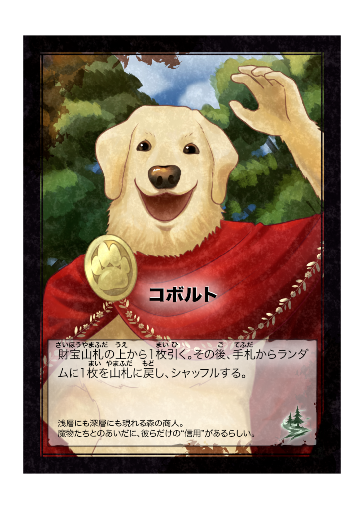 カード名 コボルト(こぼると) 分類 魔物(森の浅層) カード効果 財宝山札の上から1枚引く。その後、手札からランダムに1枚を山札に戻し、シャッフルする。 フレイバーテキスト 浅層にも深層にも現れる森の商人。魔物たちとのあいだに、彼らだけの“信用”... -