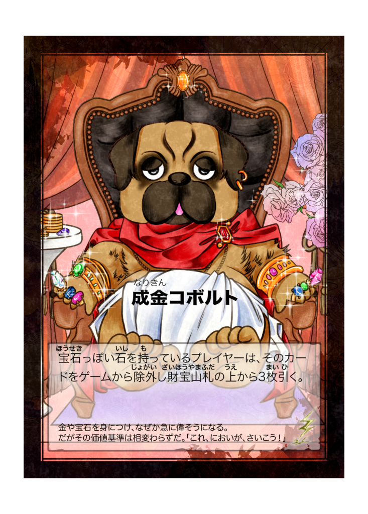 カード名 成金コボルト(なりきんこぼると) 分類 イベント カード効果 宝石っぽい石を持っているプレイヤーは、それをゲームから除外し財宝山札の上から3枚引く。 フレイバーテキスト 金や宝石を身につけ、なぜか急に偉そうになる。だがその価値基準は相... -
