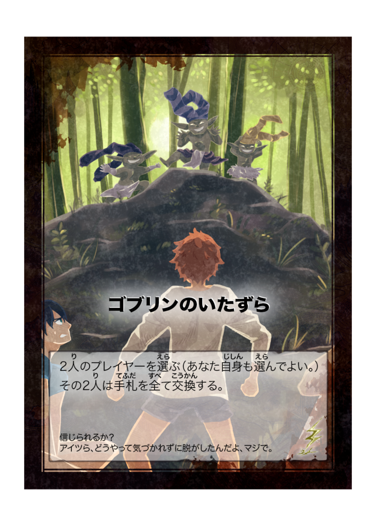 カード名 ゴブリンのいたずら(ごぶりんのいたずら) 分類 イベント カード効果 2人別々のプレイヤーを選ぶ(あなた自身も選んでよい)その2人は手札を全て交換する。 フレイバーテキスト 信じられるか?アイツら、どうやって気づかれずに脱がしたんだよ、... -