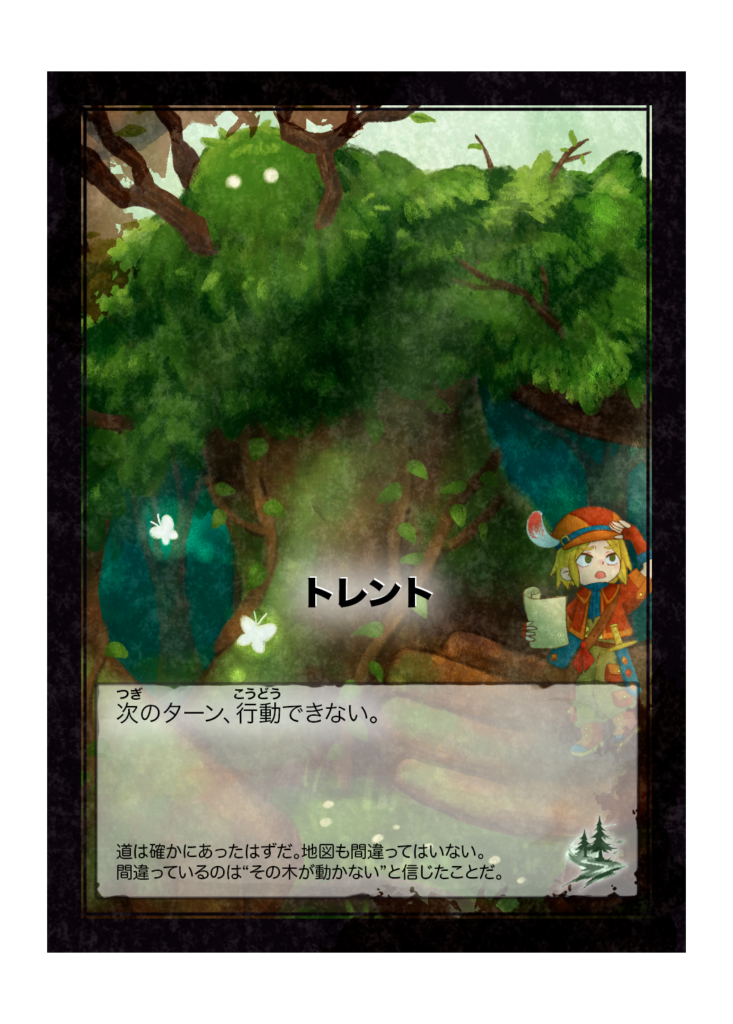 カード名 トレント(とれんと) 分類 魔物(森の浅層) カード効果 次のターン、行動できない。 フレイバーテキスト 道は確かにあったはずだ。地図も間違ってはいない。間違っているのは“その木が、動かないと信じたこと”だ。 -