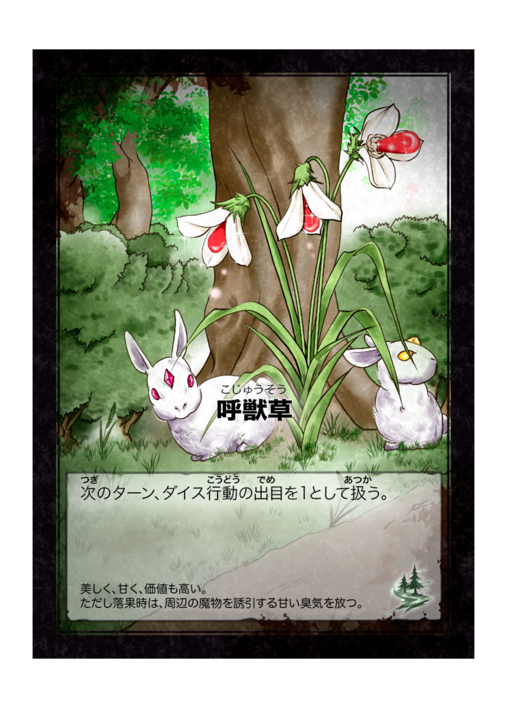 カード名 呼獣草(こじゅうそう) 分類 魔物(森の浅層) カード効果 次のターン、ダイス行動の出目を1として扱う。 フレイバーテキスト 美しく、甘く、価値も高い。ただし落果時は、周辺の魔物を誘引する甘い臭気を放つ。 -