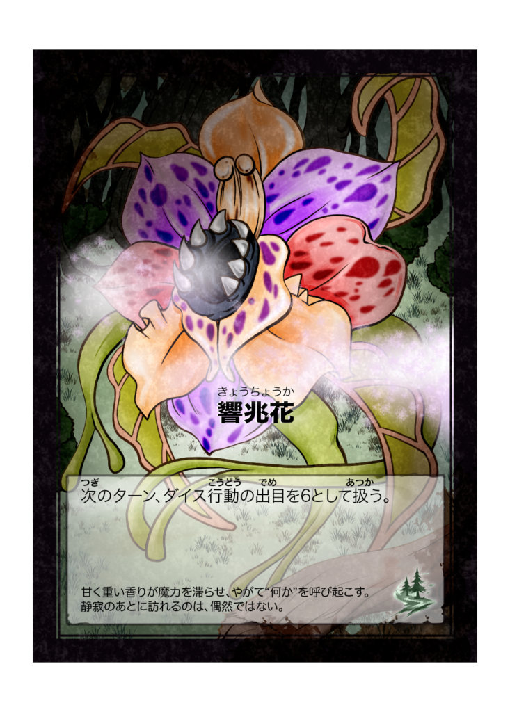 カード名 響兆花(きょうちょうか) 分類 魔物(森の浅層) カード効果 次のターン、ダイス行動の出目を6として扱う。 フレイバーテキスト 甘く重い香りが魔力を滞らせ、やがて“何か”を呼び起こす。静寂のあとに訪れるのは、偶然ではない。 -