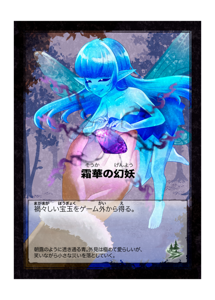 カード名 霜華の幻妖(そうかのげんよう) 分類 魔物(森の浅層) カード効果 禍々しい宝玉をゲーム外から得る。 フレイバーテキスト 朝露のように透き通る青。外見は極めて愛らしいが、笑いながら小さな災いを落としていく。 -