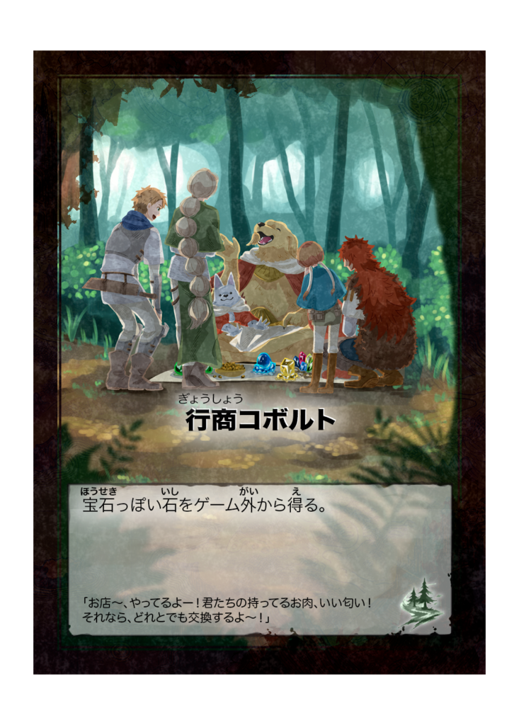 カード名 行商コボルト(ぎょうしょうこぼると) 分類 魔物(森の浅層) カード効果 宝石っぽい石をゲーム外から得る。 フレイバーテキスト 「お店〜、やってるよー!君たちの持ってるお肉、いい匂い!それなら、どれとでも交換するよ〜!」 -