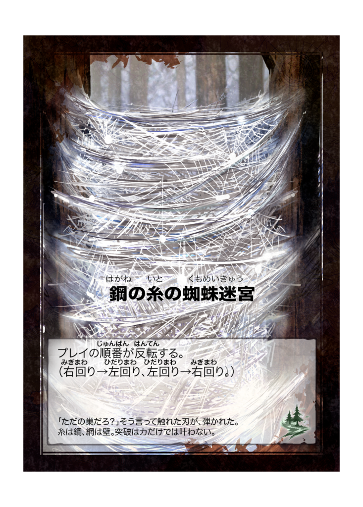 カード名 鋼の糸の蜘蛛迷宮(はがねのいとのくもめいきゅう) 分類 魔物(森の浅層) カード効果 プレイの順番が反転する。(右回り→左回り、左回り→右回り) フレイバーテキスト 「ただの巣だろ?」そう言って触れた刃が、弾かれた。糸は鋼、網は壁。突破... -