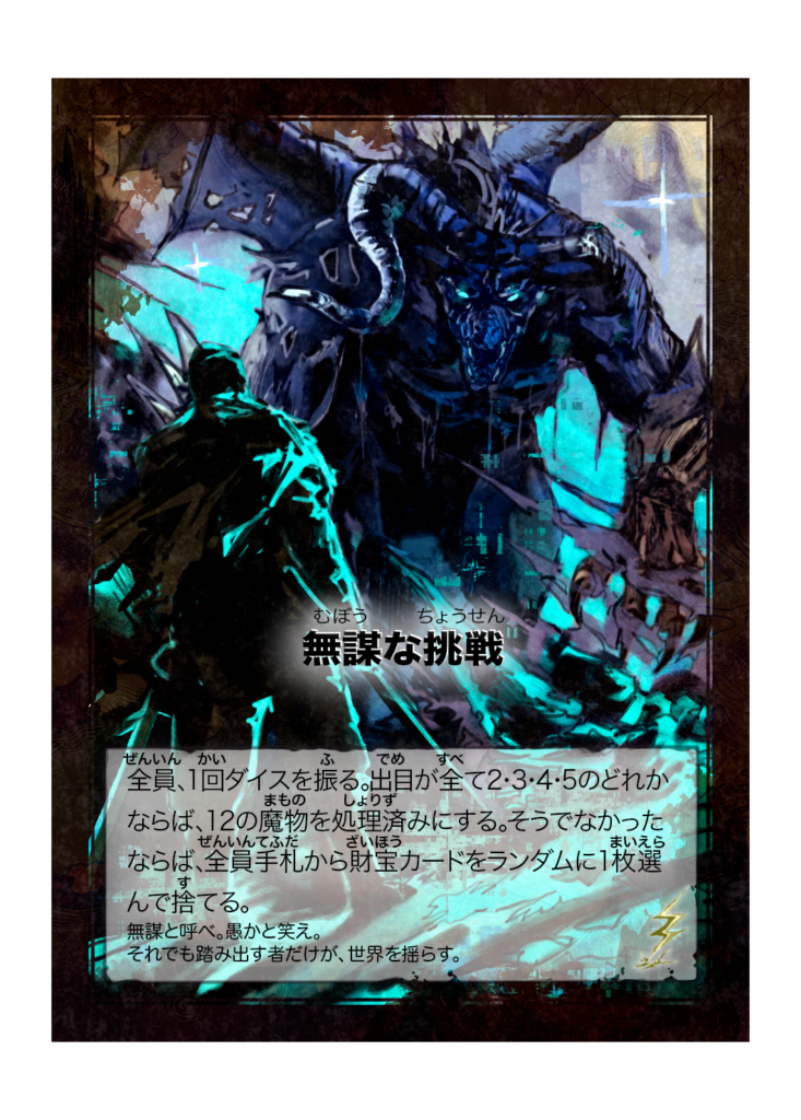 カード名 無謀な挑戦(むぼうなちょうせん) 分類 イベント カード効果 全員、1回ダイスを振る。出目が全て2・3・4・5のどれかならば、12の魔物を処理済みにする。そうでなかったならば、全員手札から財宝カードをランダムに1枚選んで捨てる。 フレイバー...