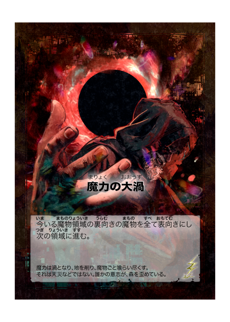 カード名 魔力の大渦(まりょくのおおうず) 分類 イベント カード効果 今いる魔物領域の裏向きの魔物を全て表向きにし、次の領域に進む。 フレイバーテキスト 魔力は渦となり、地を削り、魔物ごと喰らい尽くす。それは天災などではない。誰かの意志が、森... -