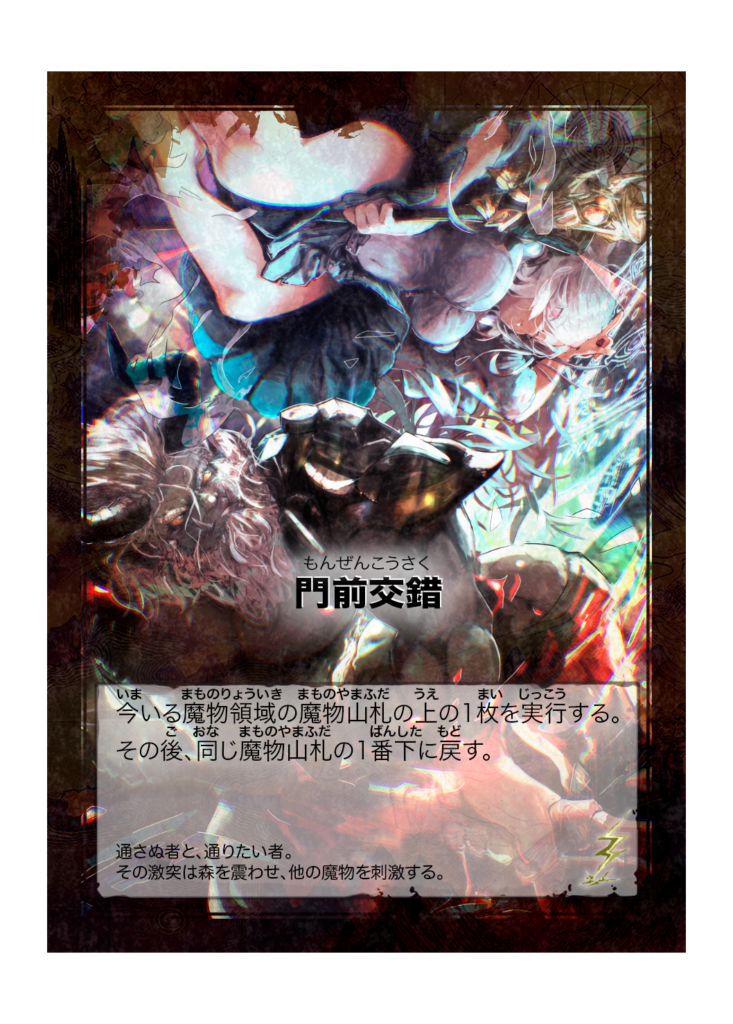 カード名 門前交錯(もんぜんこうさく) 分類 イベント カード効果 今いる魔物領域の魔物山札の上の1枚を実行する。その後、同じ魔物山札の1番下に戻す。 フレーバーテキスト 通さぬ者と、通りたい者。その激突は森を震わせ、他の魔物を刺激する。 -