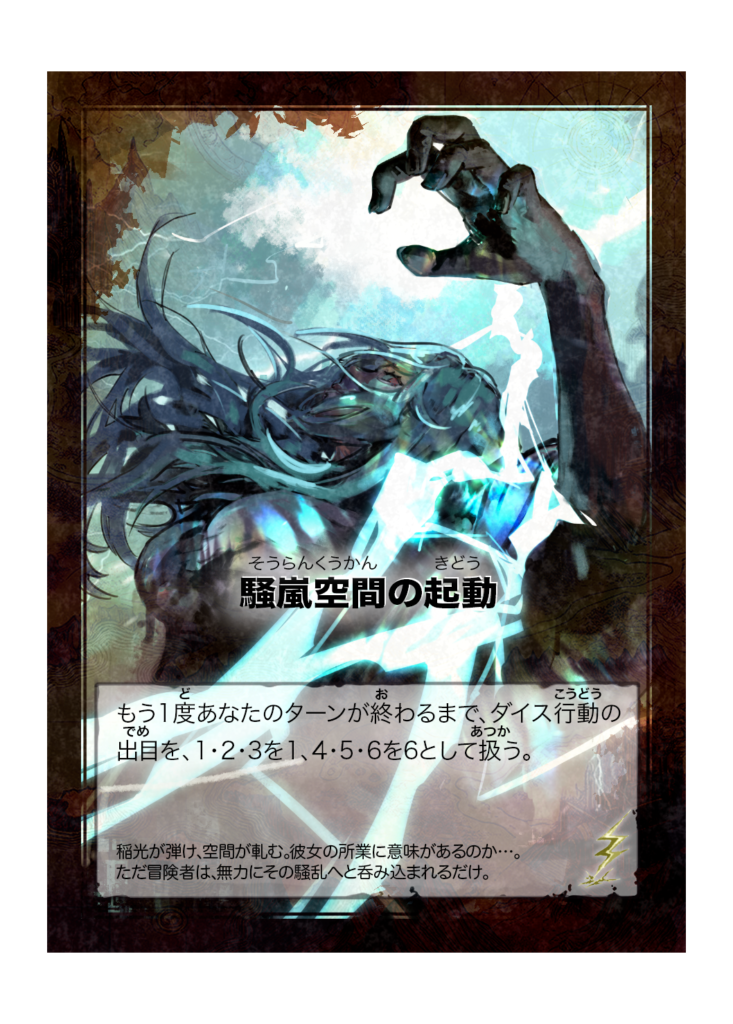 カード名 騒嵐空間の起動(そうらんくうかんのきどう) 分類 イベント カード効果 もう1度あなたのターンが終わるまで、ダイス行動の出目を、1・2・3を1、4・5・6を6として扱う。 フレイバーテキスト 稲光が弾け、空間が軋む。彼女の所業に意味があるのか... -